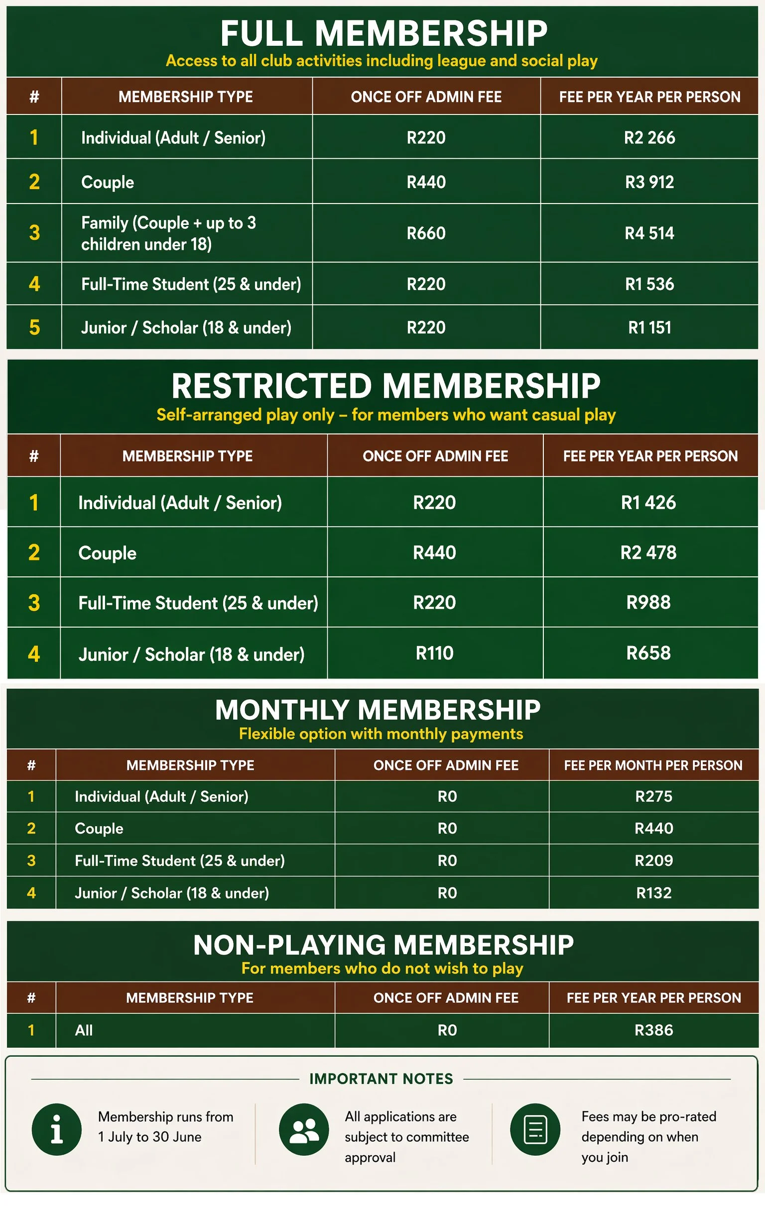 Includes organised social play on Saturday afternoons and later in the afternoons of Wednesdays, for which balls are provided. Full membership also entitles one to play league.